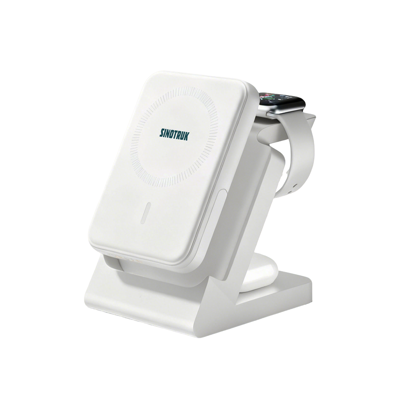 集手机无线充电、手表充电、蓝牙耳机充电于一体,同时内置 5000 毫安时移动电源,可在桌面支架与便携电源模式间灵活切换,满足居家、办公、出行等多场景的充电需求。