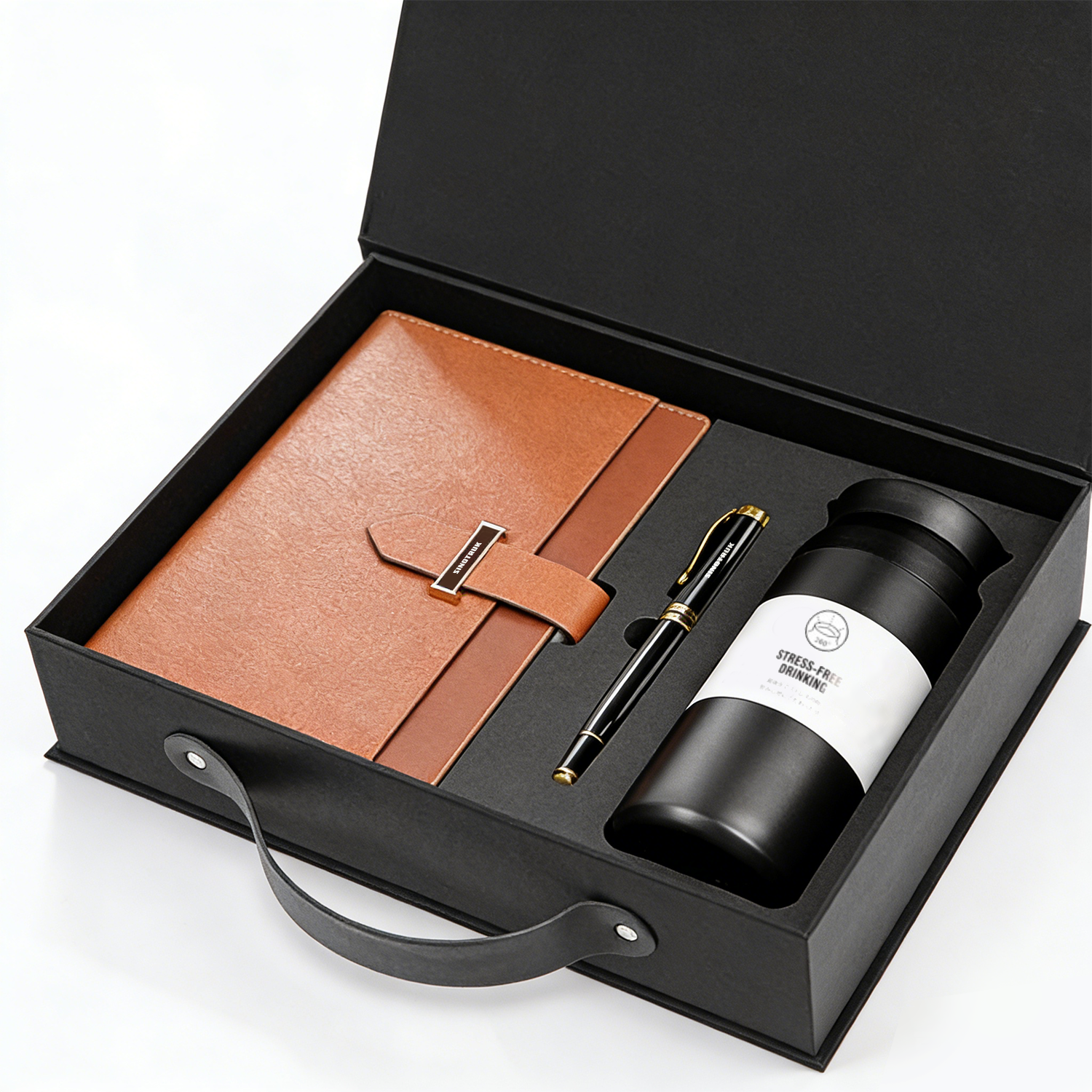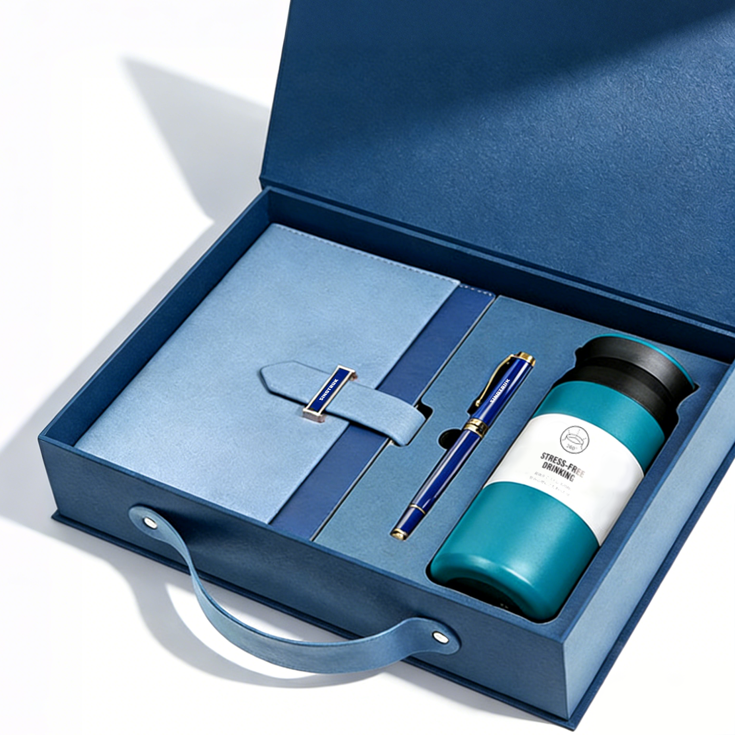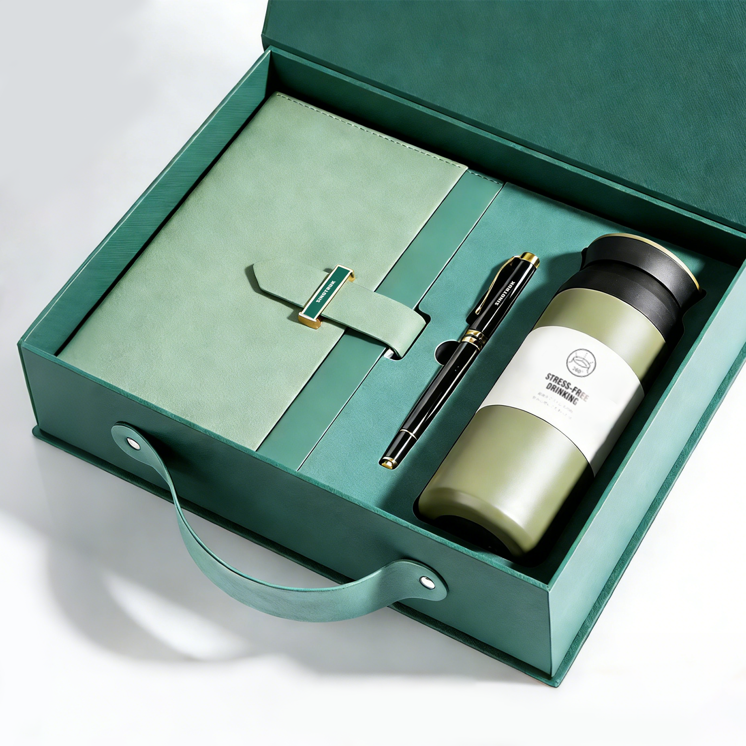 一款兼具实用与质感的商务礼品套装,包含磁吸搭扣笔记本、金属笔与保温水杯,采用礼盒包装并支持全套定制。多色可选,适合作为企业伴手礼、客户答谢礼,满足商务场景下的礼品需求。