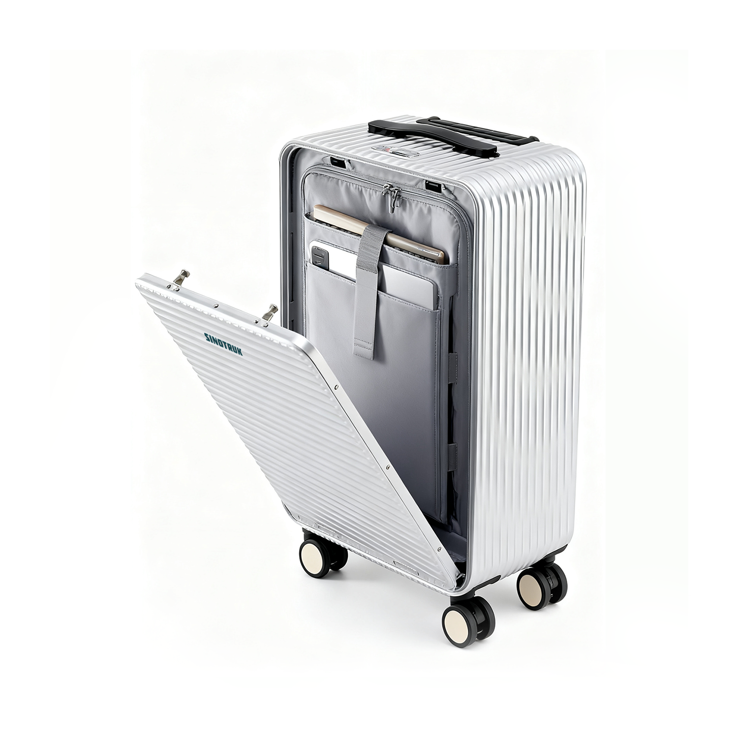 一款采用全铝合金材质打造的前开盖拉杆箱,兼具坚固耐用与商务质感,前开盖设计方便快速取放电脑、文件等物品,特别适合商务出差场景。配备静音万向轮与顺滑拉杆,外观简洁高级,多尺寸可选,满足不同出行需求。